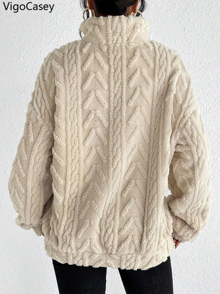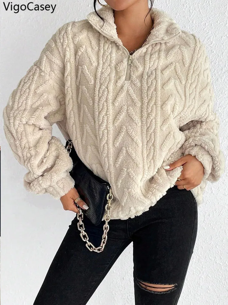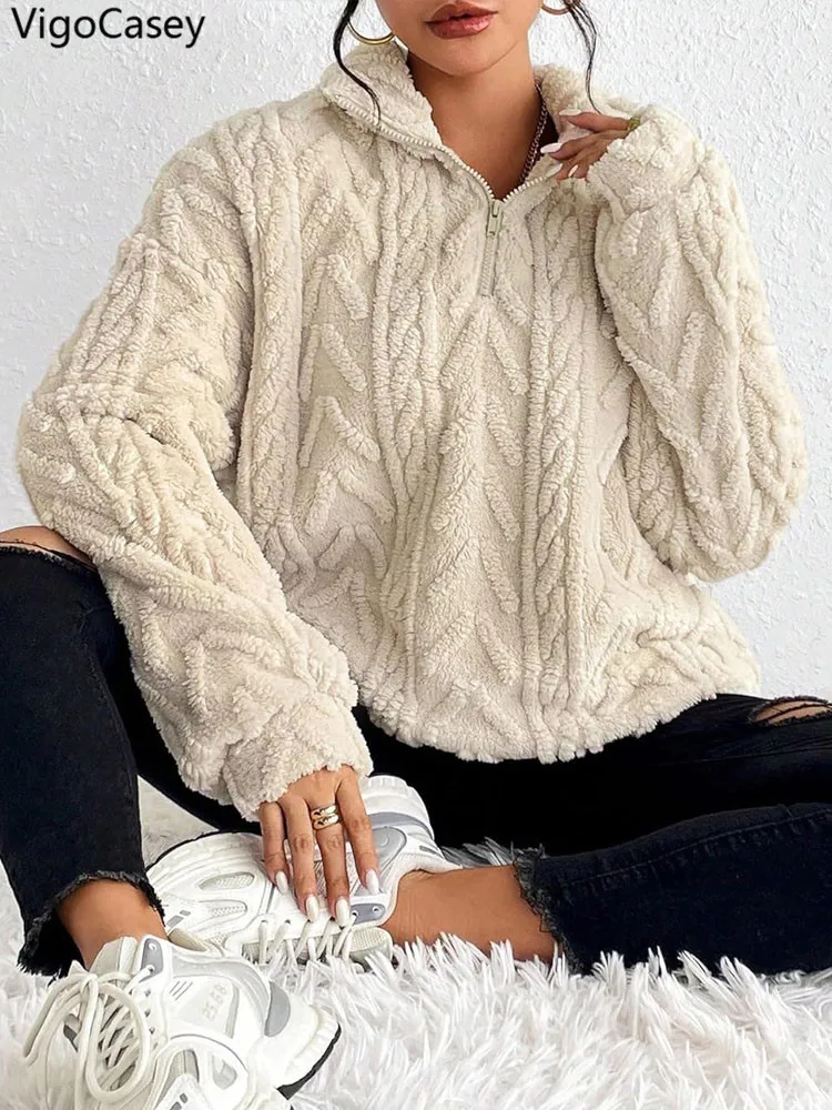VigoCasey 2025 Autumn Winter Women Khaki Pullover Long Sleeve Zipper Stand Collar Sweatshirt Casual Lady Loose Plush Hoodie Tops VigoCasey 2025 Autumn Winter Women Khaki Pullover Long Sleeve Zipper Stand Collar Sweatshirt Casual Lady Loose Plush Hoodie Tops